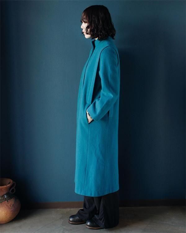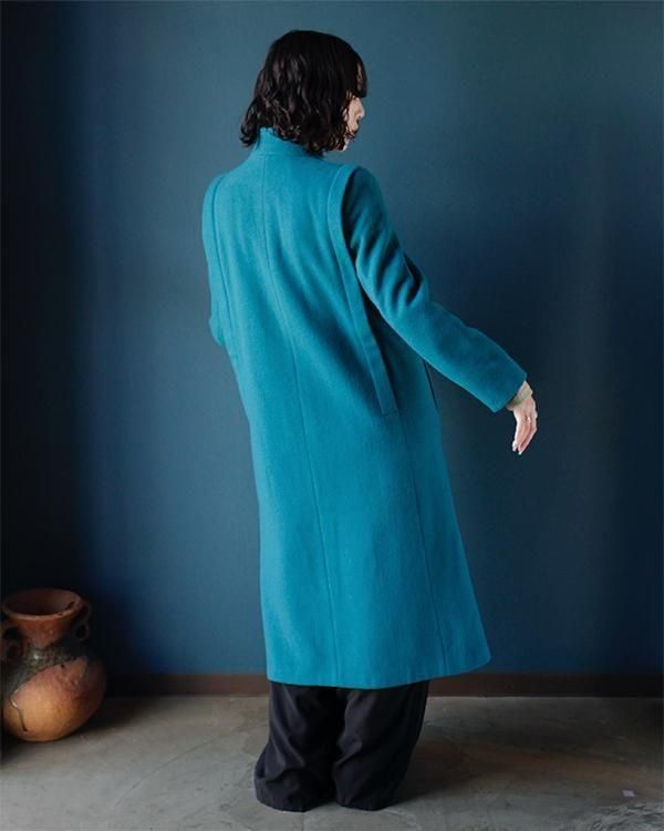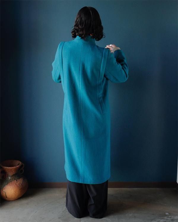 鮮やかなティファニーブルーが魅力的なロングコート。