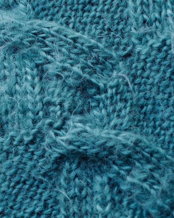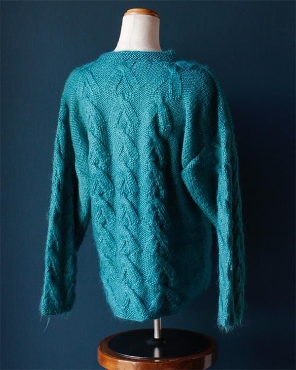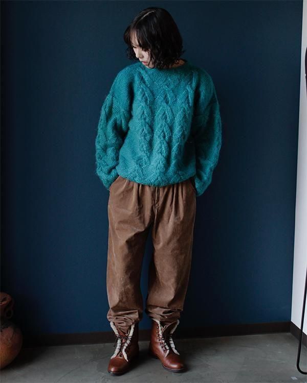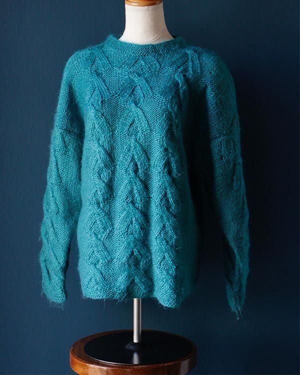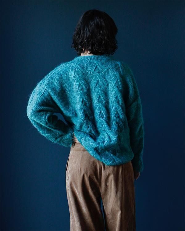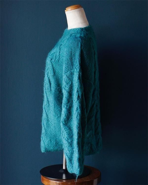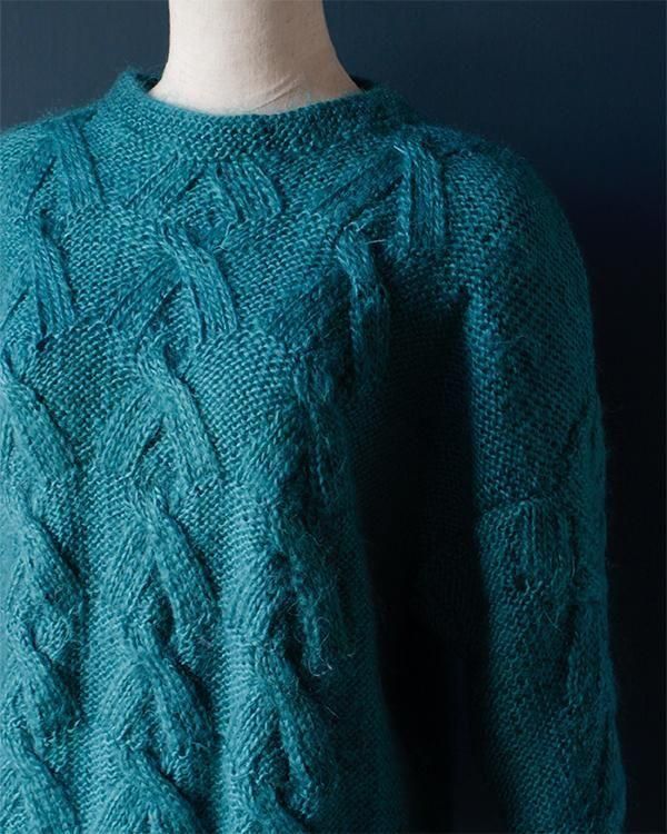 手編みの鮮やかなエメラルドグリーンが魅力的なケーブルニット。