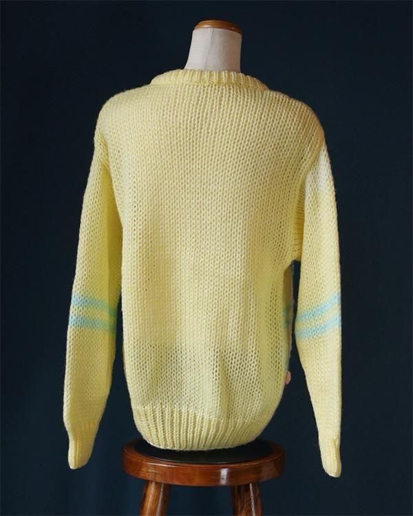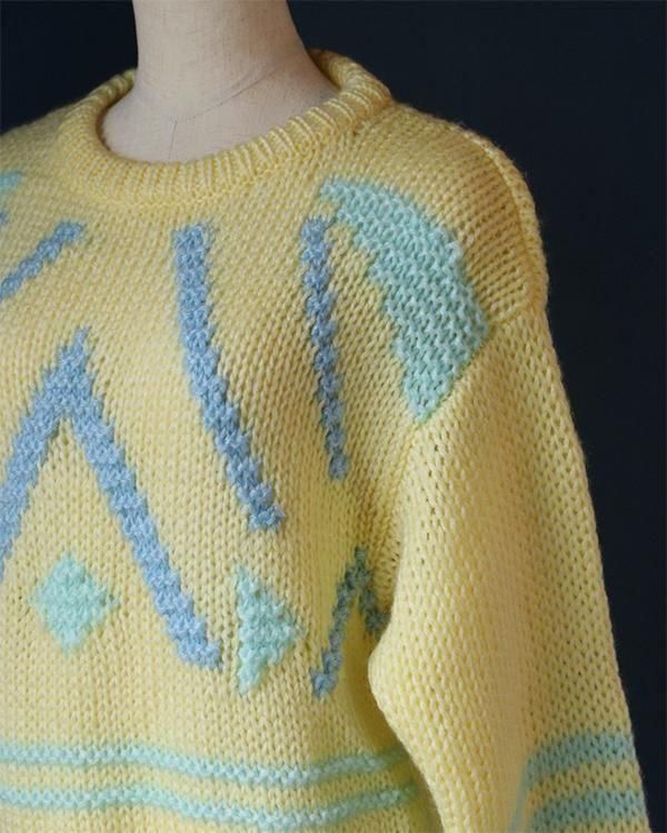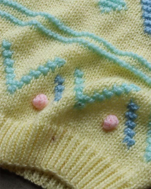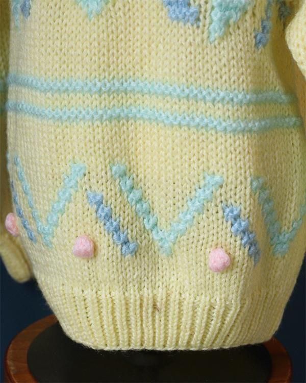 イエローベースにカラフルな刺繍が可愛い、ハンドメイド幾何学模様ニット。