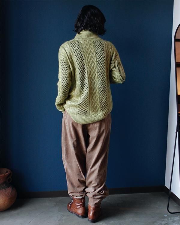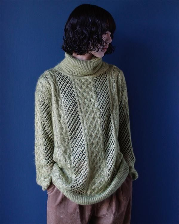 ハンドメイドの透かし編みタートルネックニット。