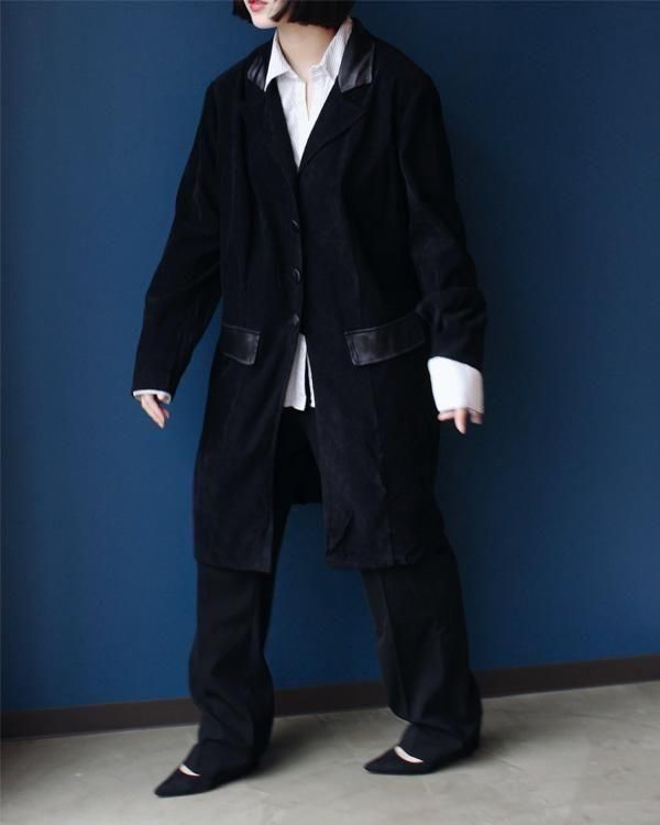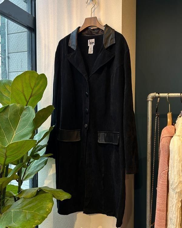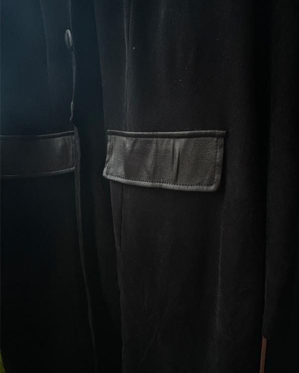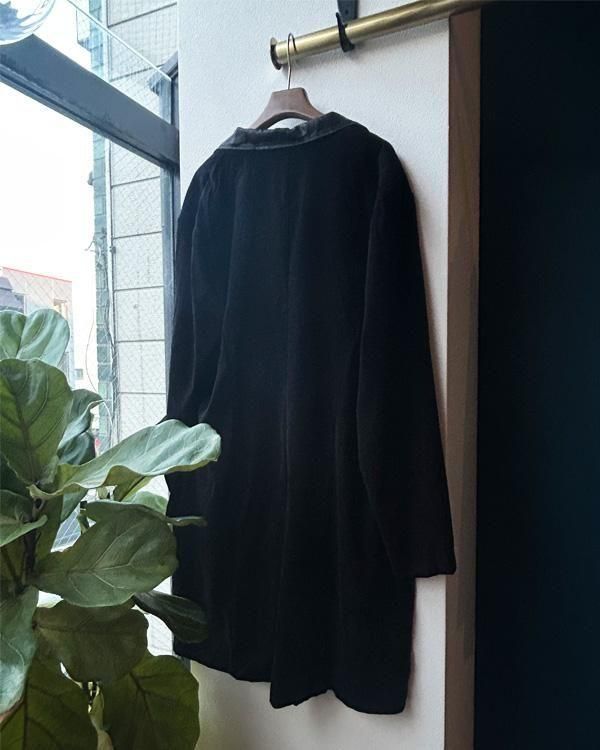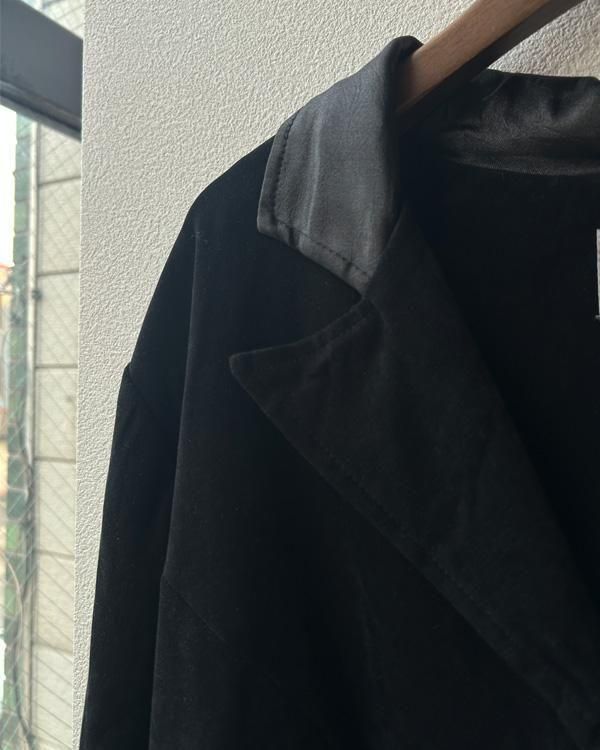 ベロアのロングテーラードジャケット。襟は光沢のあるサテン生地とベロアの
