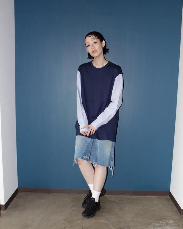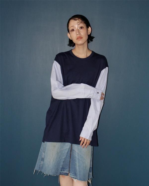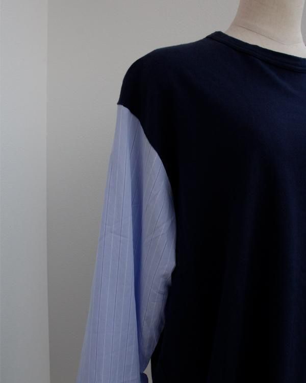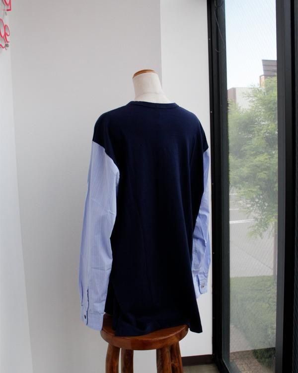 袖部分はストライプシャツ、ボディはTシャツのスイッチロンT。