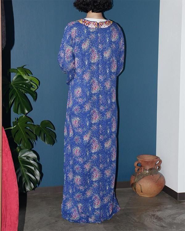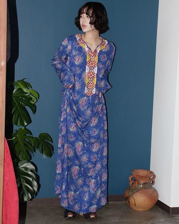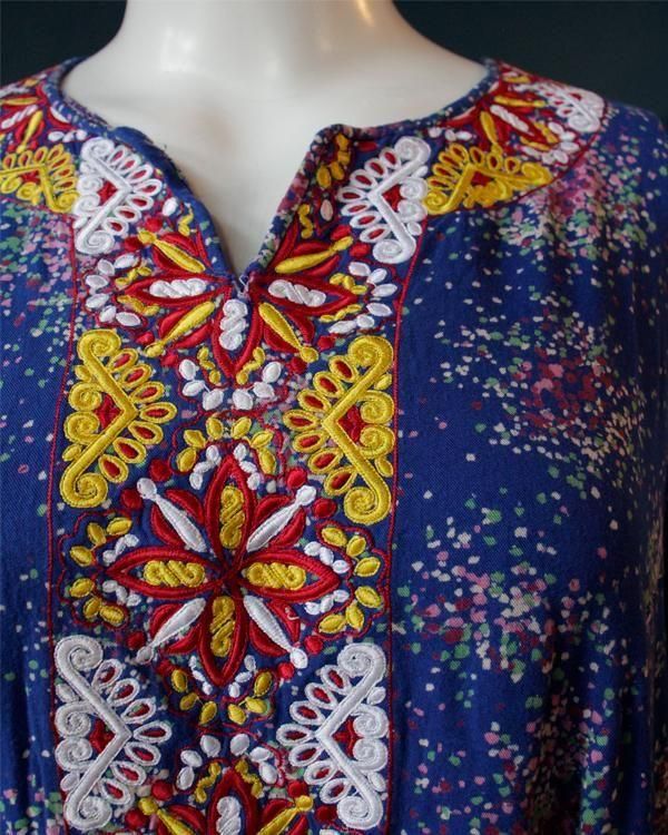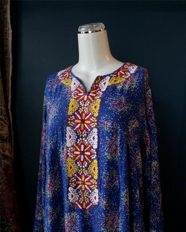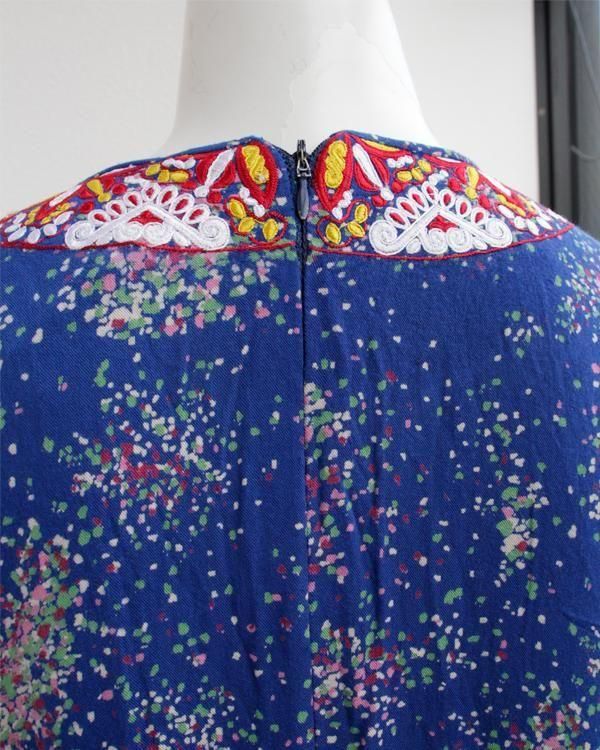伸縮性のある薄めの生地ワンピース。胸元にはフォークロア調に刺繍が施されています。