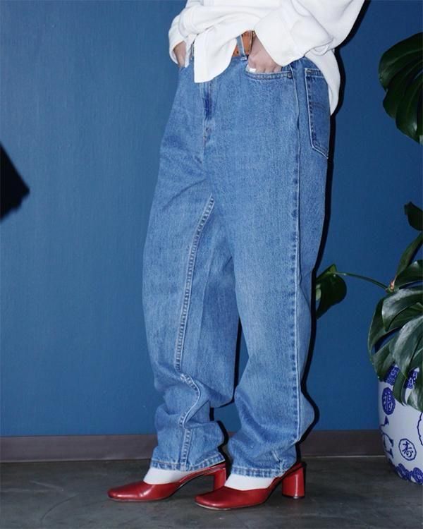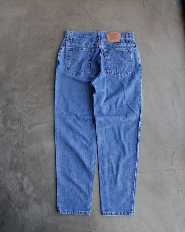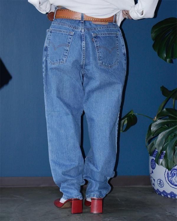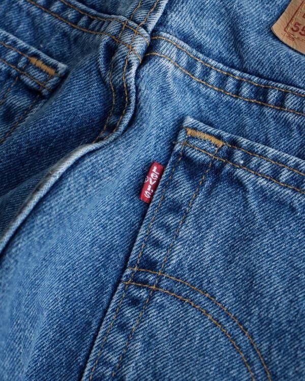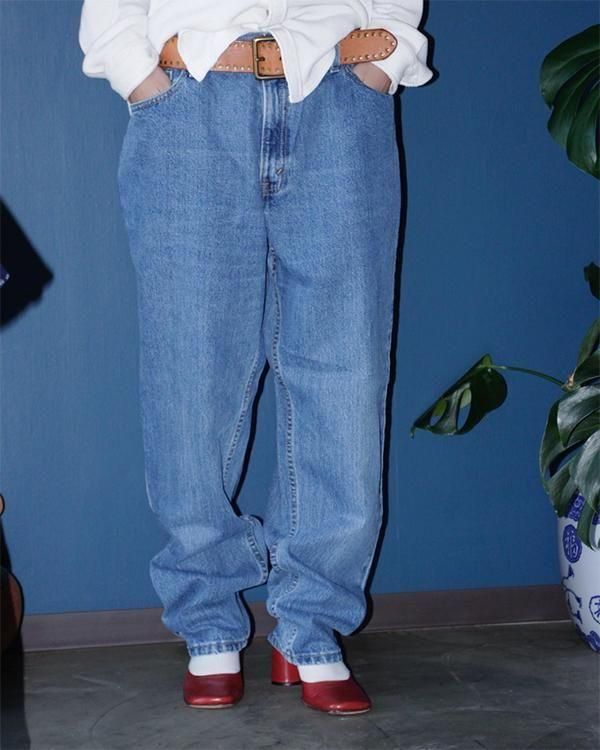 2000年USA製のリーバイス550。ウェストは32インチほどのサイズ感です。裾にかけてテーパードの効いています。モモ幅は太めなので、スニーカーやパンプスでも引きずらず着用できます。