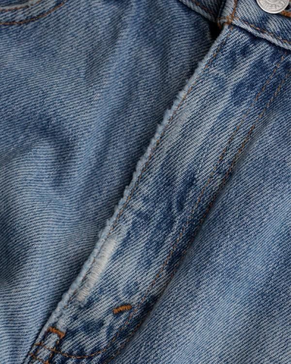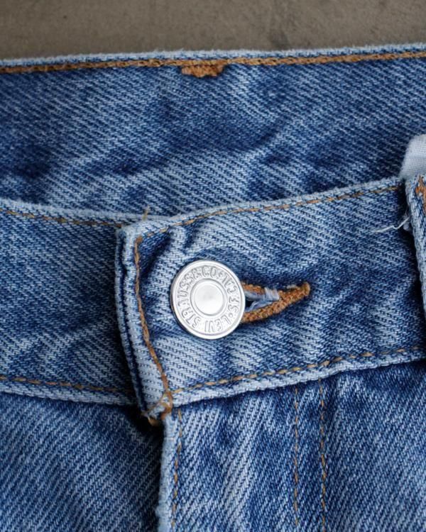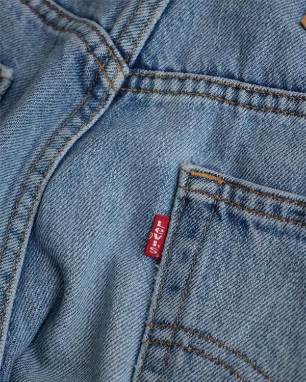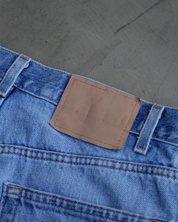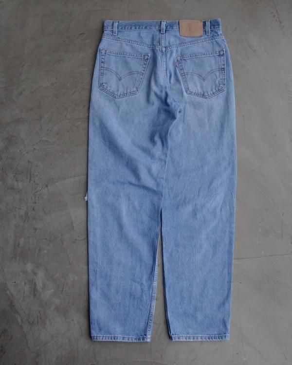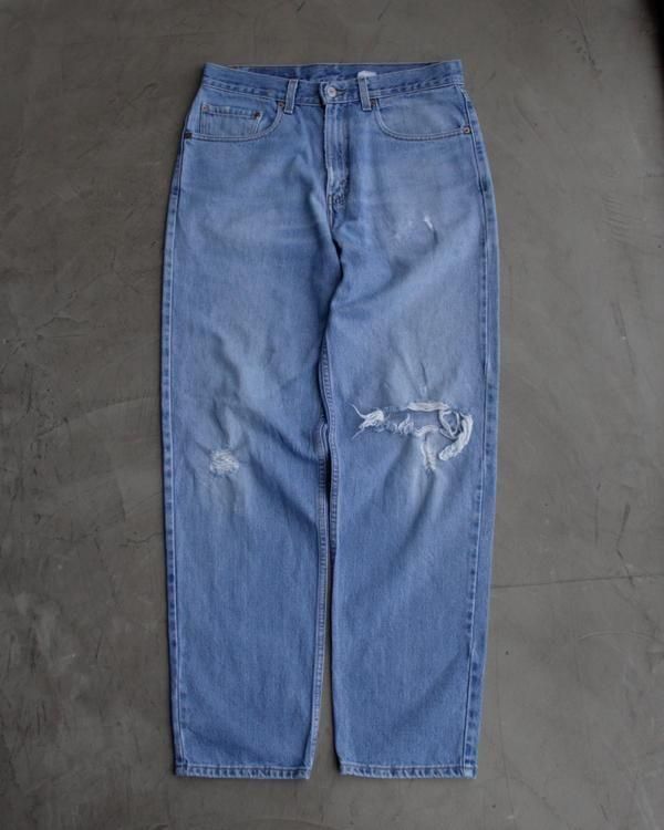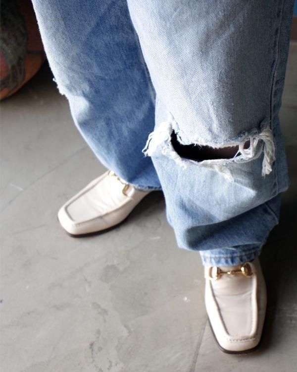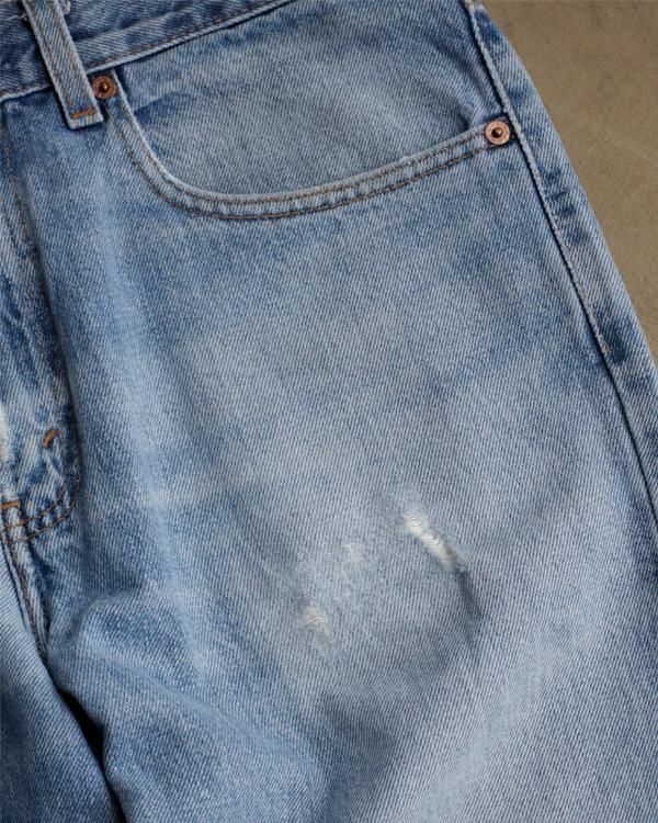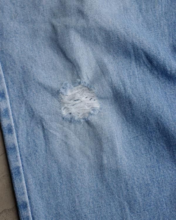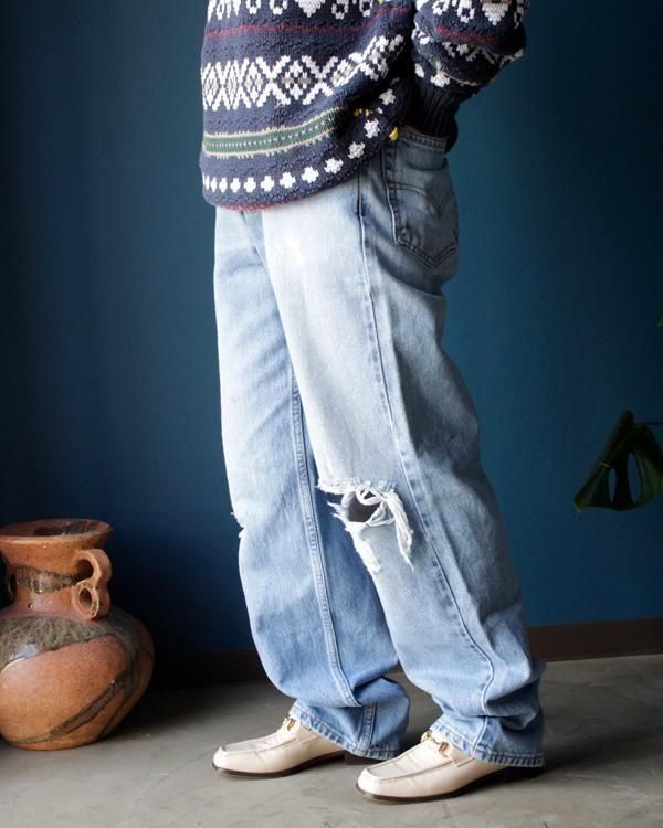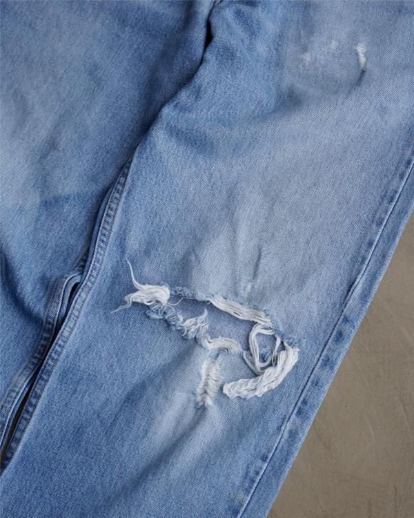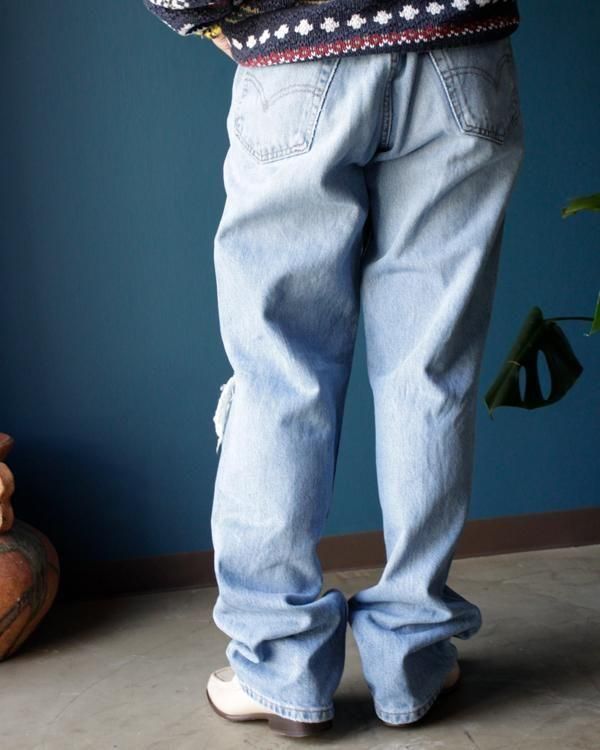リーバイス505、色はライトブルーです。両ひざに破けあり。インナーにカラータイツを見せて履くのも◎