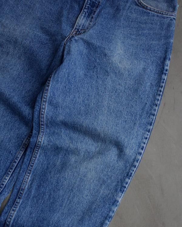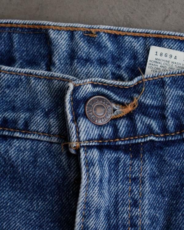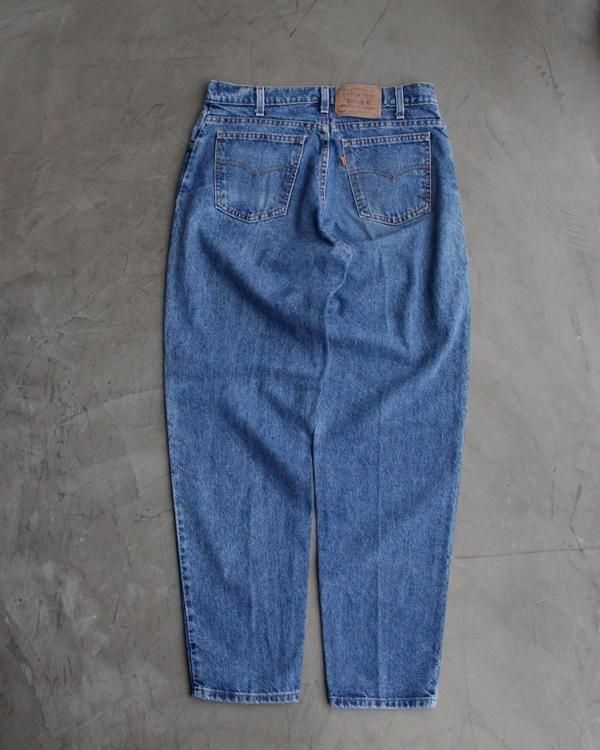 リーバイス550の94年製オレンジタブです。色はミドルウォッシュです。裾に向けて少しテーパードの効いた形なので、ローテクシューズや、低いパンプスが程よく着用できます。