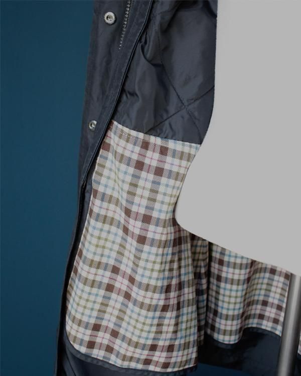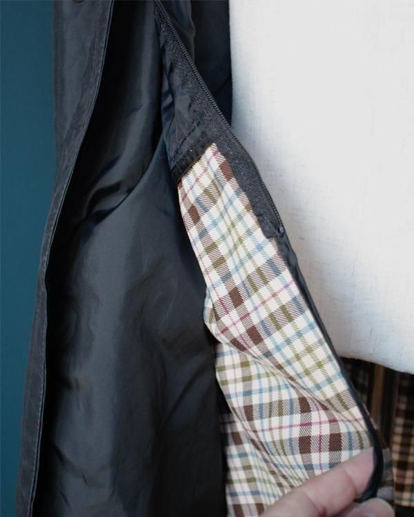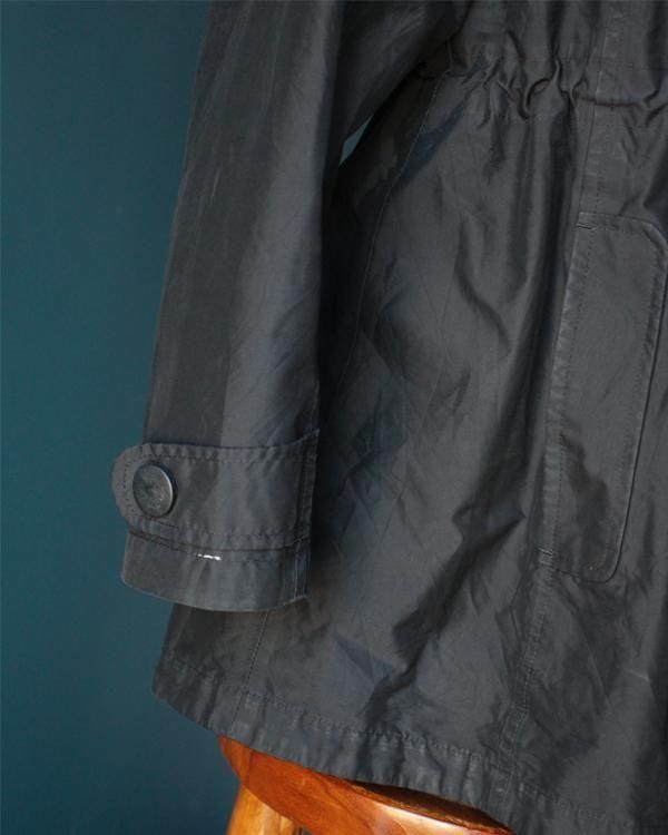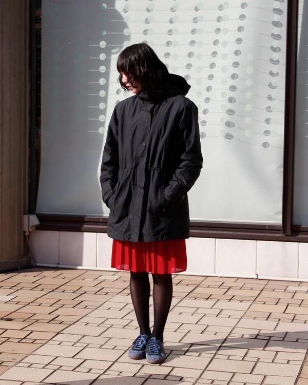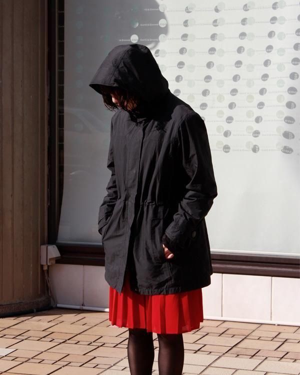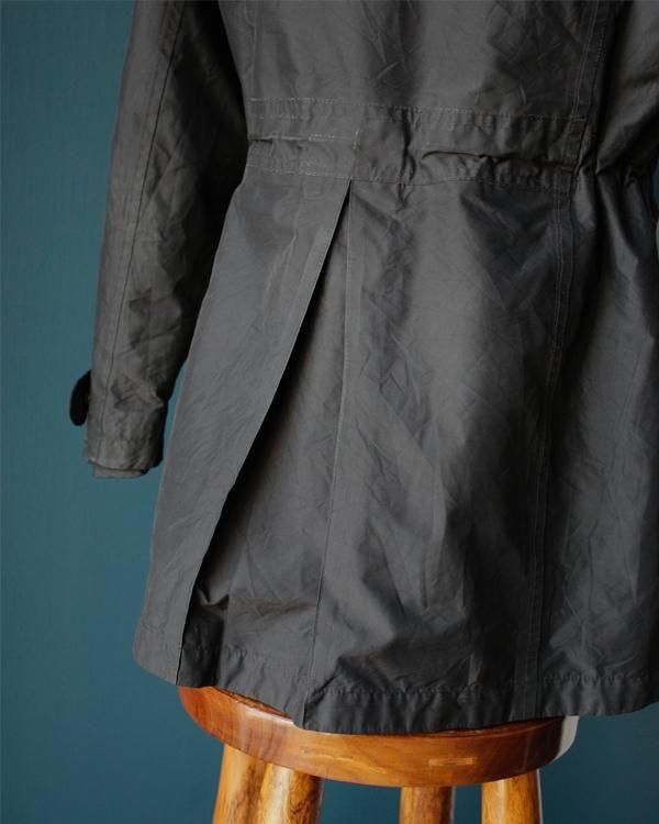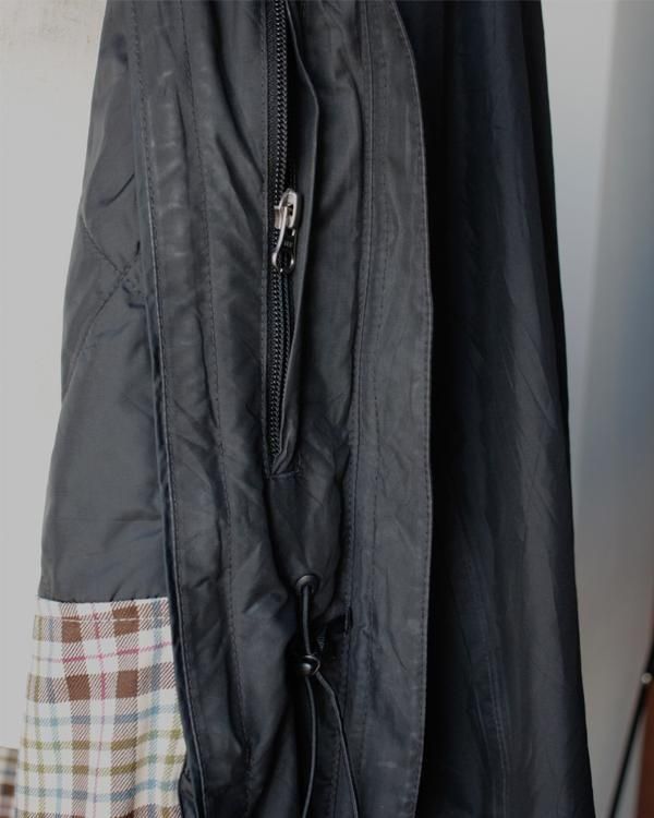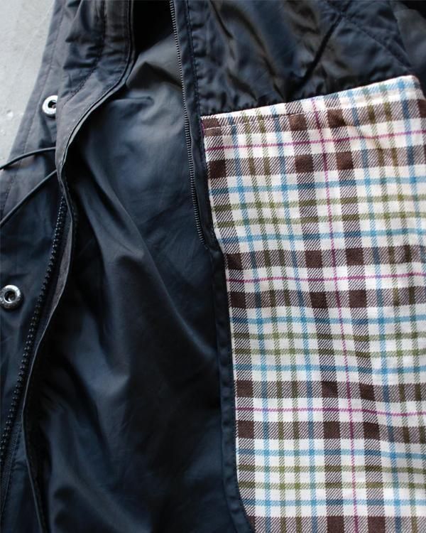 裏地のチェック柄と、袖口の大きめのボタンが可愛さ出してます。裾にプリーツあり。ライナーはファスナーで着脱可能。腰にドローコードがあるので、ミリタリーのスモッグ風に着用できます。ロングスカートと相性◎
