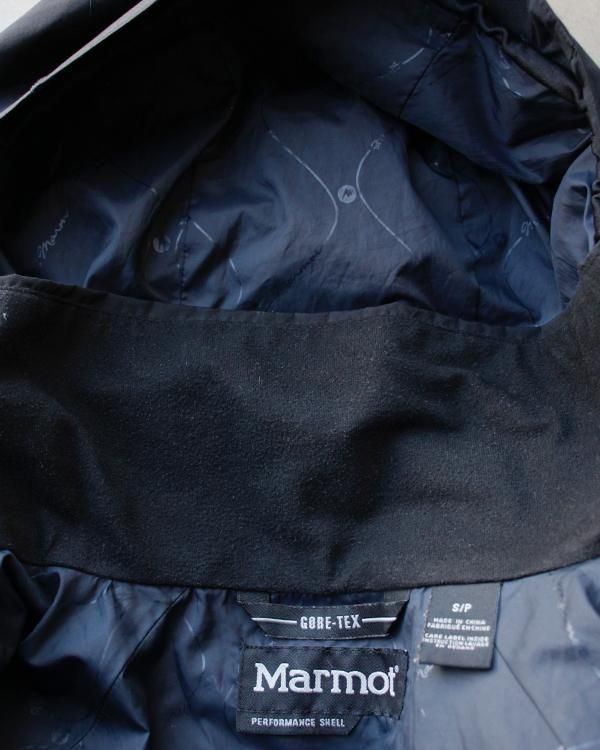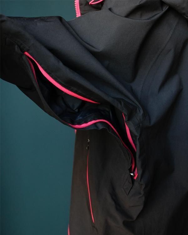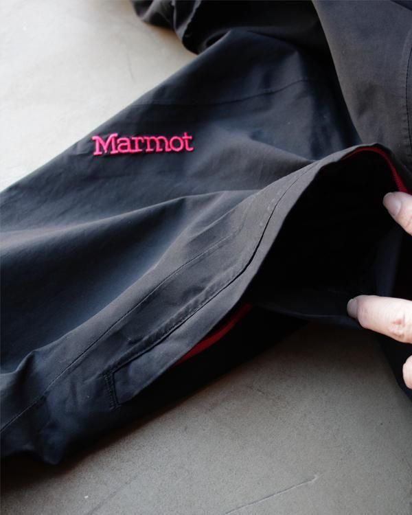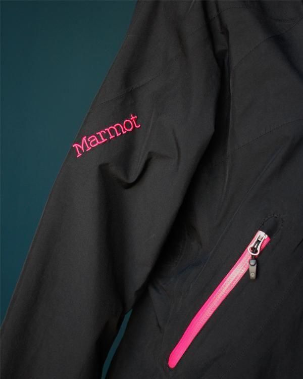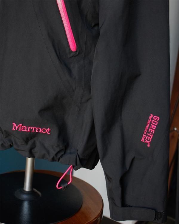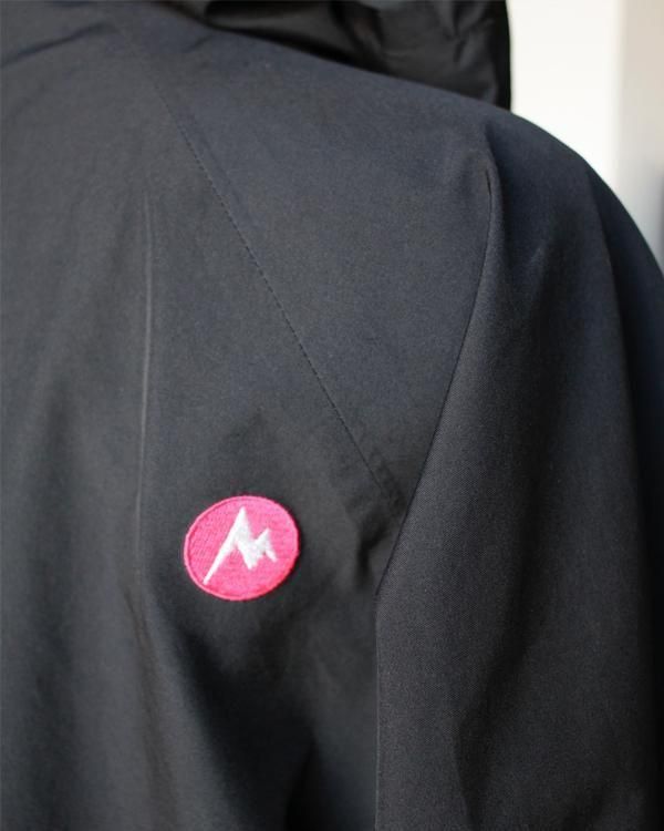 マーモットマウンテンパーカー。ビビットピンクの刺繍が魅力的です。