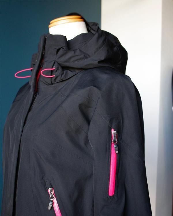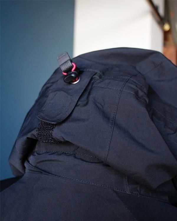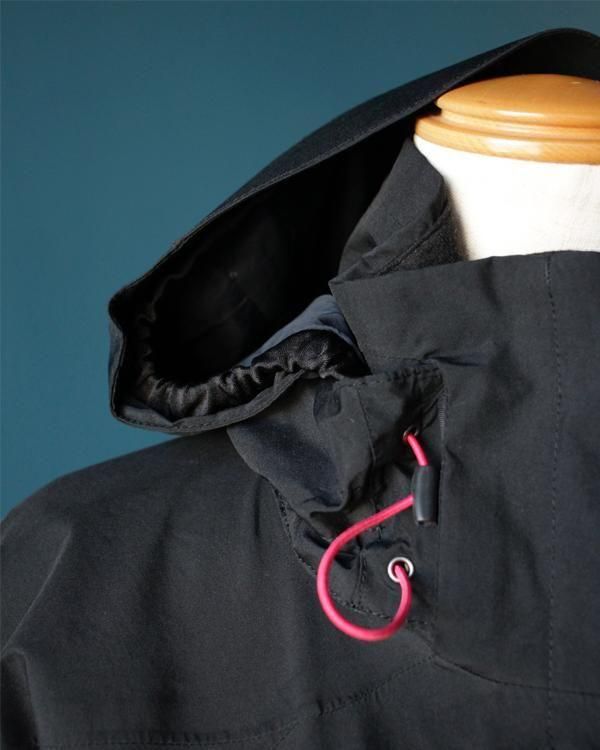 ダブルジップで裾、フード部分にドローコードが付いており、