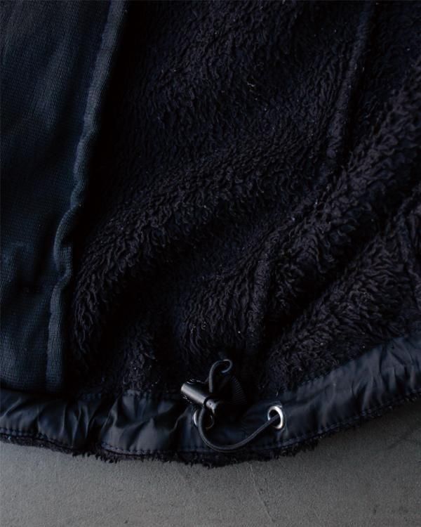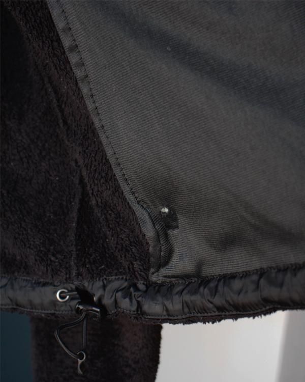 裾は両脇にドローコードが付いているので絞ることもできます。胸のロゴ刺繍とファスナーは、薄いパステルカラーのグリーンカラーです。