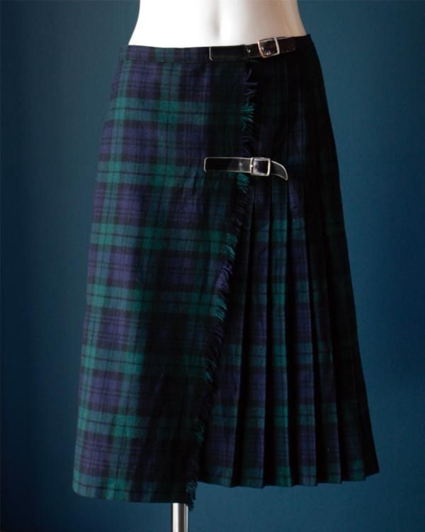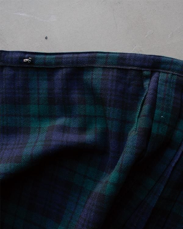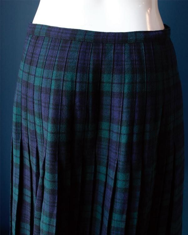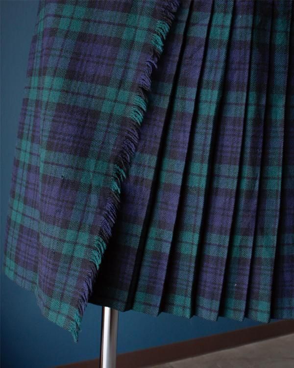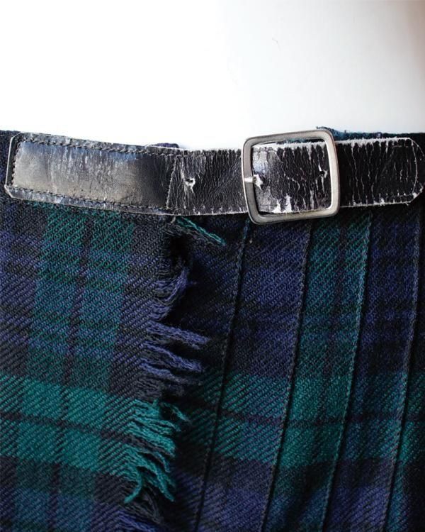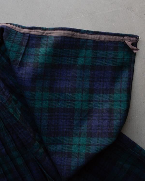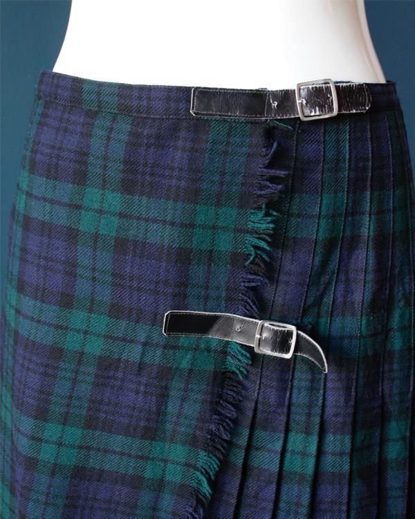 イギリス製タータンチェックのラップスカート。内側にホックがあり、留めることができます。綺麗なプリーツでパンツの上に着用してロンドンぽく。