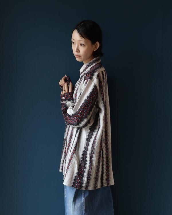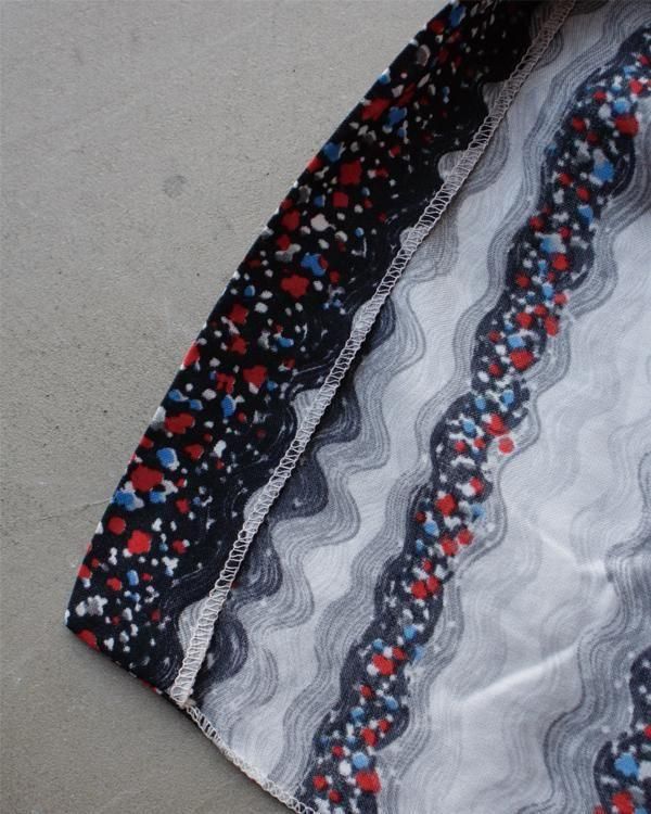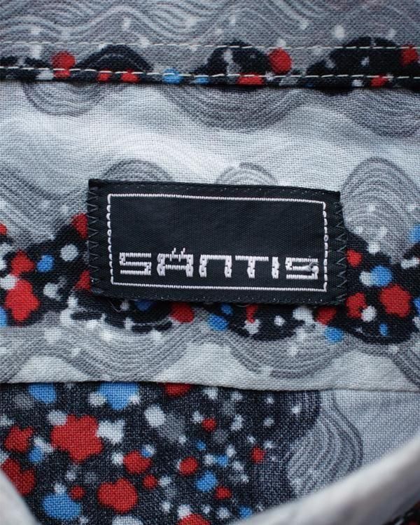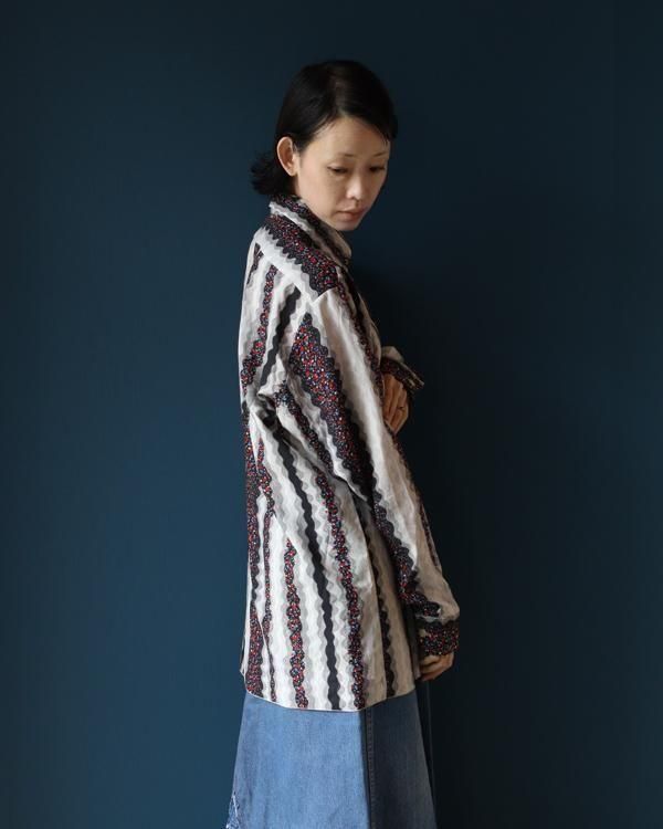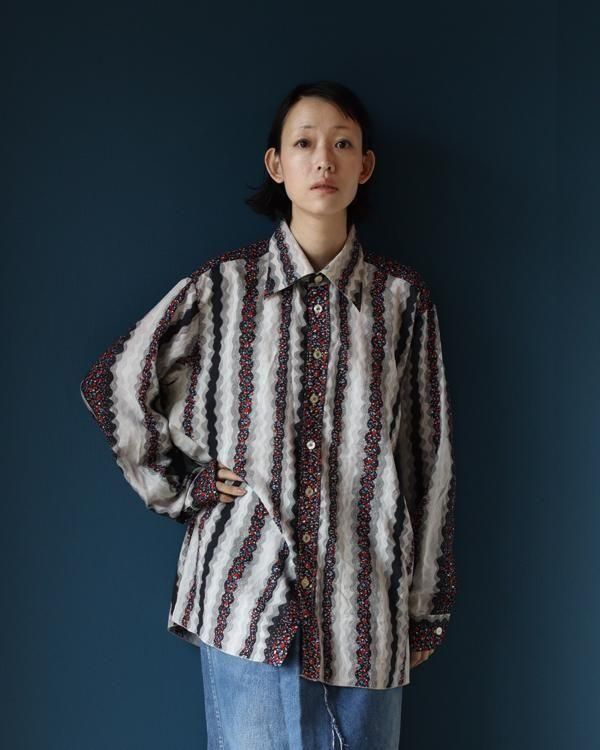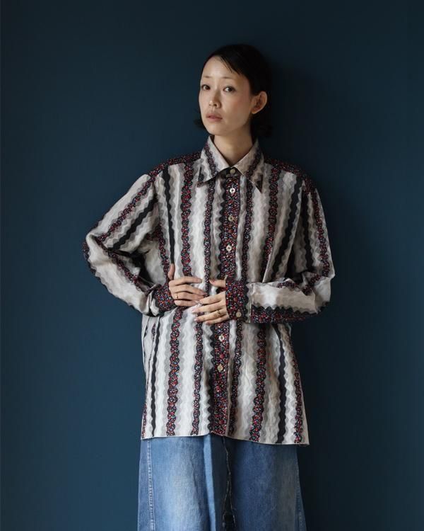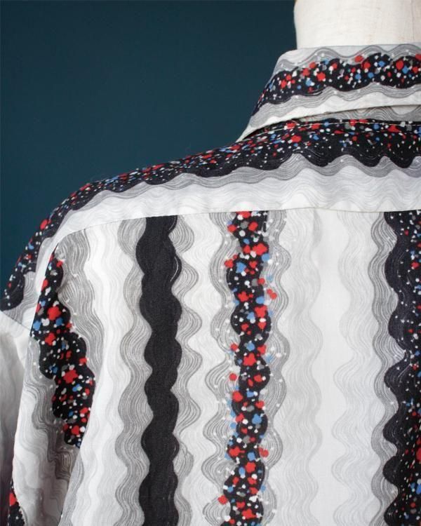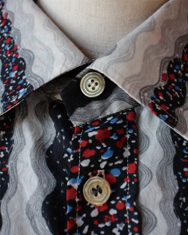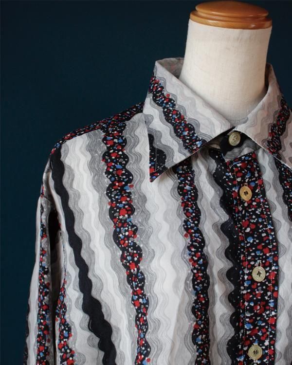 柔らかい薄い80年代シャツ。襟はレトロに尖った大きめ。柄がミャクミャクを連想するカラフルさ。