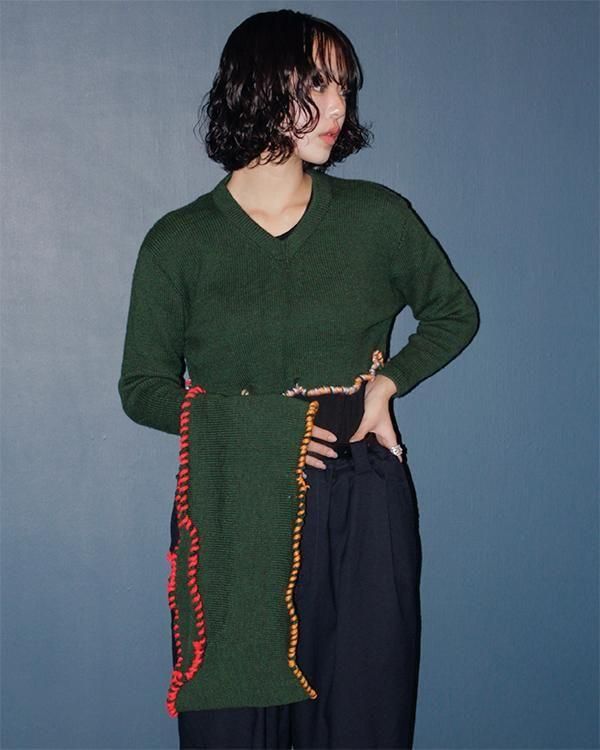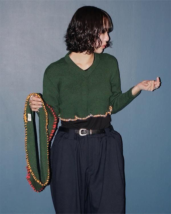 Vネックのクロップドニットに、お好みでネックウォーマーを取り外しできます。