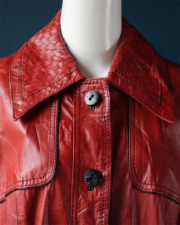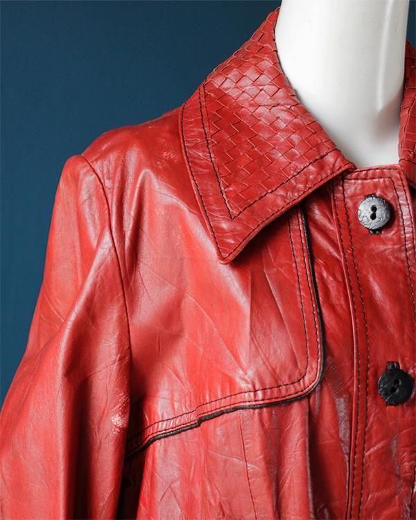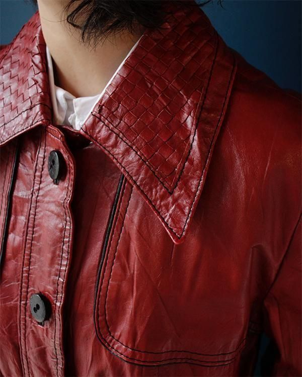 襟やポケットの、レザーが編み込まれたイントレチャートデザインが魅力的です。